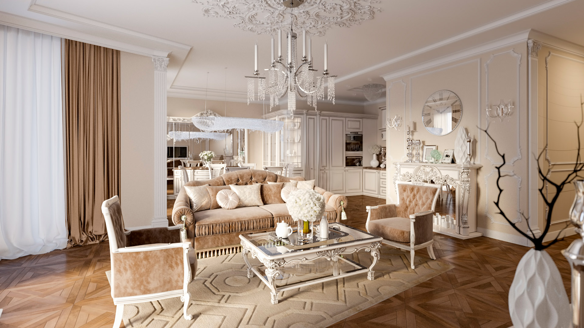 En acabados del estilo clásico se utilizan los colores oliva, beige, crema, verde claro y dorado.